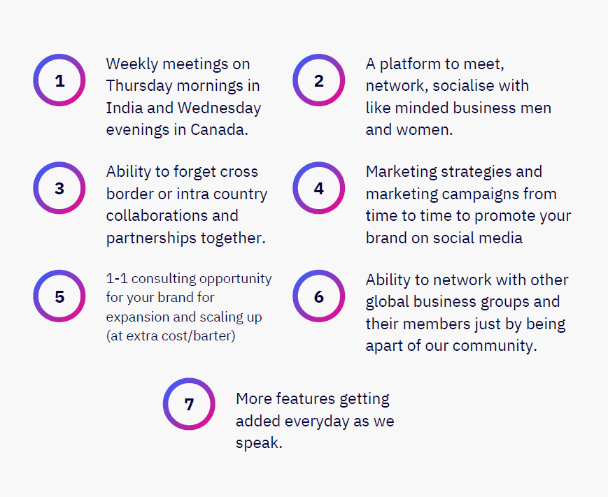 An INDO CANADIAN community of small businesses and startups to facilitate opportunities and business information from India, Canada, the World and vice versa in order to empower and scale their businesses in these countries. We are the sole platform to connect people with each other because we believe that everything starts by connecting people together. We also consult and handhold small businesses and startups to launch/expand into the Indian/North American markets by connecting them to service providers/stakeholders.